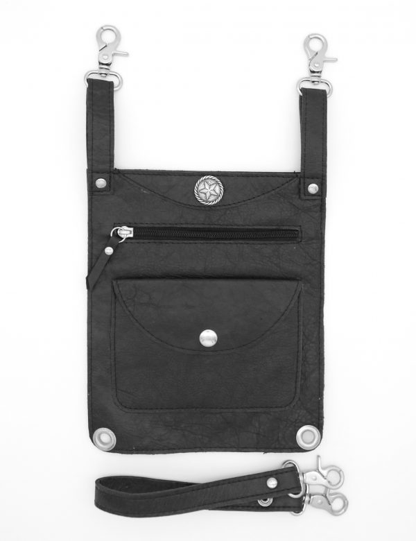 R750.00Made from Genuine Bovine full Grain South African leather. This biker bag has an adjustable strap that fits around your leg and the snap hooks clips to your belt loops. The bag is 36cm long and 20cm wide. Ideal for your credit of debit card at toll gates and your cell phone fits easily. To customise your bag, choose a concho at the accessories menu and studs of your choice.